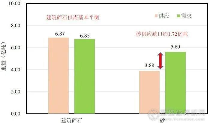 圖2 廣東省2019年建筑用砂石需求及供應量統計圖