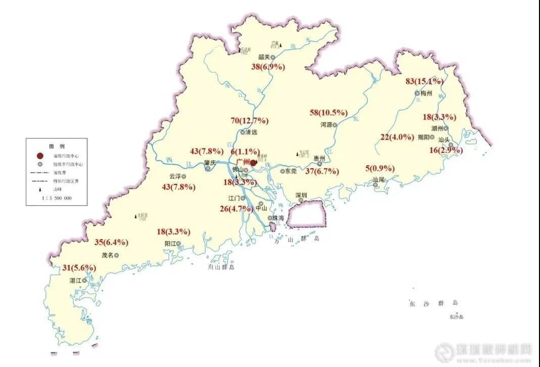 注:圖中地名旁邊的數字表示建筑碎石石場數目,括號中的數字表示該地區占廣東省總建筑碎石石場數目比例