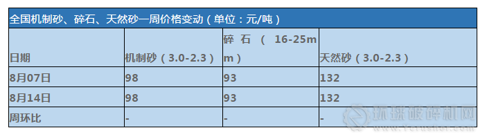 具體來看本周機制砂、碎石、天然砂價格變動情況如下: