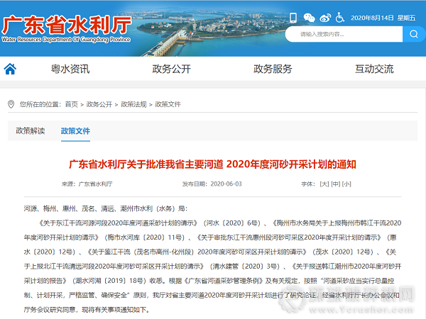 根據《廣東省河道采砂管理條例》及有關規定,按照“河道采砂應當實行總量控制、計劃開采,嚴格監管、確保安全”原則,廣東省水利廳對省主要河道2020年度河砂開采計劃進行了研究論證,經省水利廳廳長辦公會議和廳務會議研究同意,現將有關事項通知如下。