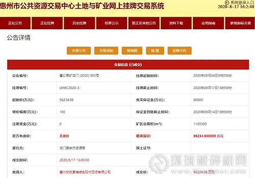 龍門縣龍華鎮朗背村葛埔礦區位于惠州市龍門縣龍華鎮朗背村,礦區面積1.1693k㎡,查明資源儲量為16620.45萬立方米,設計確定可開采資源儲量11751.07萬立方米;年開采規模600萬立方米,出讓年限22年,起拍價96234.98萬元。
