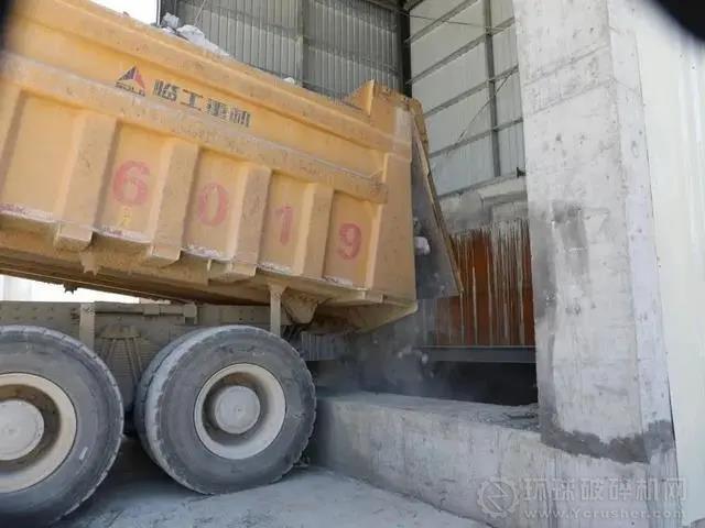 一整車毛石正在進行粉碎