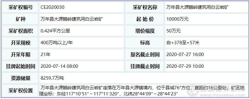 江西省上饒市萬年縣大源鵝嶺建筑用白云巖礦礦權在萬年縣大源鎮境內,位于縣城76°方位,直距約16公里處,礦區地理坐標:東經117°10′51″~117°11′320″,北緯28°44′09″~28°44′23″;面積0.424平方公里,標高自+378至+57米,資源儲量8259.7萬噸,開采規模400萬噸以上/年,開采年限21年,起始價10000萬元。