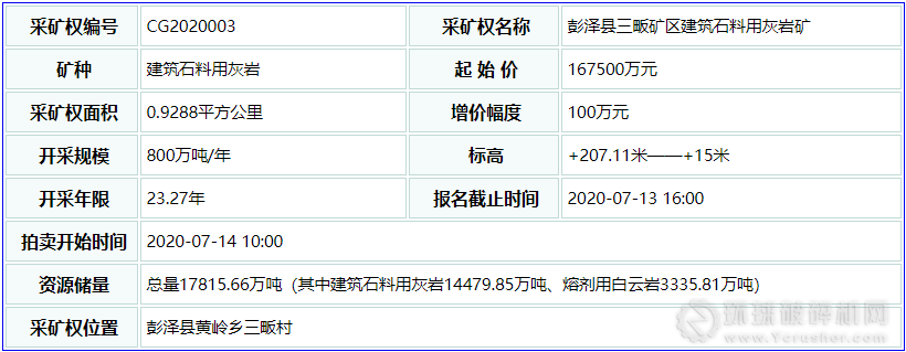 江西省九江市彭澤縣三畈礦區建筑石料用灰巖礦在彭澤縣黃嶺鄉三畈村,面積0.9288平方公里,標高+207.11米—+15米,資源儲量總量17815.66萬噸(其中建筑石料用灰巖14479.85萬噸、熔劑用白云巖3335.81萬噸),開采規模800萬噸/年,開采年限23.27年,起始價167500萬元。