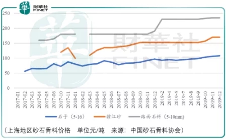 隨著供給側(cè)在砂石行業(yè)的推進(jìn),供需缺口使得砂石骨料單位價格逐級攀升,這一變化的邏輯也適用于水泥混凝土行業(yè)。截至2019年12月,上海地區(qū)砂石骨料中石子已從2017年初的50元每噸左右漲至100元每噸、全國水泥價格指數(shù)已從2016年初的80左右上漲至160左右、全國混凝土指數(shù)已從2016年初100左右上漲至160左右。
