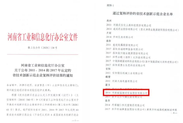 根據《技術創新示范企業認定工作實施方案(試行)》(工信部聯科﹝2010﹞540號)和 《河南省工業和信息化廳辦公室關于開展技術創新示范企業復核評價工作的通知》(豫工信辦科﹝2020﹞43號)要求,河南省工業和信息化廳組織專家對61家省技術創新示范企業進行了復核評價。河南威猛振動設備股份有限公司成功通過復評。