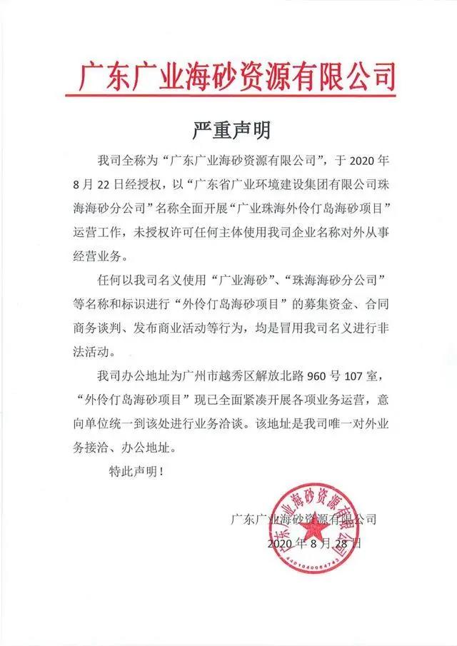 對此,項目運營方廣東廣業海砂資源有限公司正式發出聲明,表示目前網上使用“廣業海砂”、“珠海海砂分公司”等名稱和標識進行“外伶仃島海砂項目”的募集資金、合同商務談判、發布商業活動等行為,均是冒用該公司名義進行非法活動。
