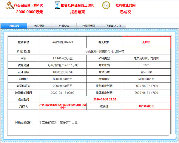 8月31日,廣西自貿區泰盛新材料科技有限公司以1.885億的成交價競得欽南區犀牛腳鎮嶺門村建筑用砂巖、花崗巖采礦權。