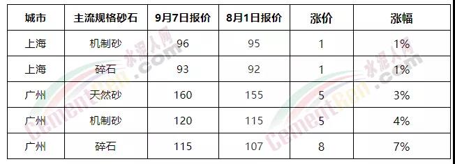 9月7日砂石均價108元/噸較8月初均價107元/噸上漲1元/噸。全國重點城市主流規(guī)格砂石市場報價各別品種出現(xiàn)小幅上調,廣州碎石價格漲幅達7%。
