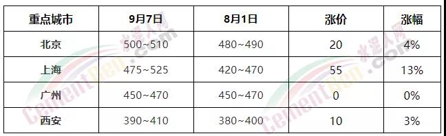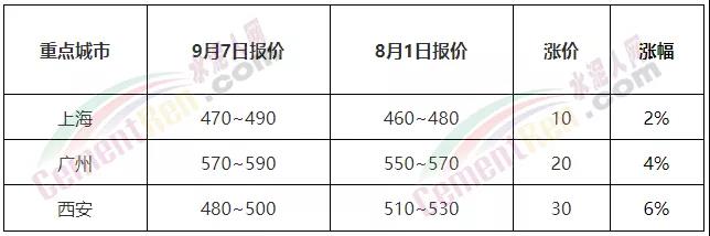 9月7日全國34個主要城市C30現(xiàn)款、非泵均價432元/方,較8月初431元/方上漲1元/方,重點城市上海,廣州,西安等重點城市均有小幅上漲。