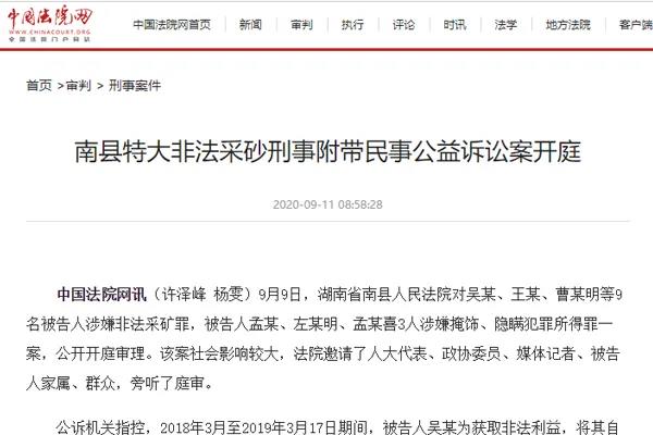 9月9日,湖南省南縣人民法院對吳某、王某、曹某明等9名被告人涉嫌非法采礦罪,被告人孟某、左某明、孟某喜3人涉嫌掩飾、隱瞞犯罪所得罪一案,公開開庭審理。該案社會影響較大,法院邀請了人大代表、政協委員、媒體記者、被告人家屬、群眾,旁聽了庭審。
