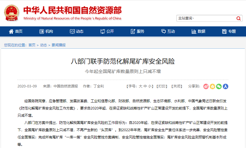 經國務院同意,應急管理部、發展改革委、工業和信息化部、財政部、自然資源部、生態環境部、水利部、中國氣象局近日聯合印發《防范化解尾礦庫安全風險工作方案》,要求自2020年起,在保證緊缺和戰略性礦產礦山正常建設開發的前提下,全國尾礦庫數量原則上只減不增。