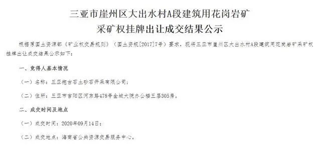 近日,三亞市崖州區大出水村A段建筑用花崗巖礦采礦權在海南省公共資源交易服務中心進行拍賣,經過多輪激烈競價,最終以3.66億元成交,開采年限為10年,這是三亞近8年以來出讓的首個采礦權,將緩解三亞市建筑石料和機制砂等礦產供應緊張的矛盾,助力三亞各類重點項目更好更快地落地,助力海南自貿港建設。