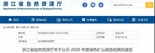 9月24日,浙江省自然資源廳發布《浙江省自然資源廳關于公示 2020 年度綠色礦山遴選結果的通告》,通告稱,浙江省自然資源廳組織開展了 2020 年度綠色礦山遴選工作,通過企業申報、第三方評估和省級實地核查,按照優中選優的原則,遴選出 10 個礦山予以推薦列入國家綠色礦山名錄,具體名單如下: