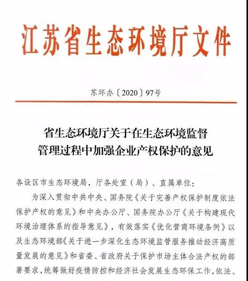 近日江蘇省生態環境廳出臺《關于在生態環境監督管理過程中加強企業產權保護的意見》,通過對守法企業無事不擾,標桿企業豁免, 嚴禁環保“一刀切”,保護企業產權。