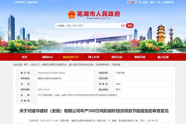 近日,建華建才(安徽)有限公司年產500萬噸機制砂技改項目節能報告審查通過。