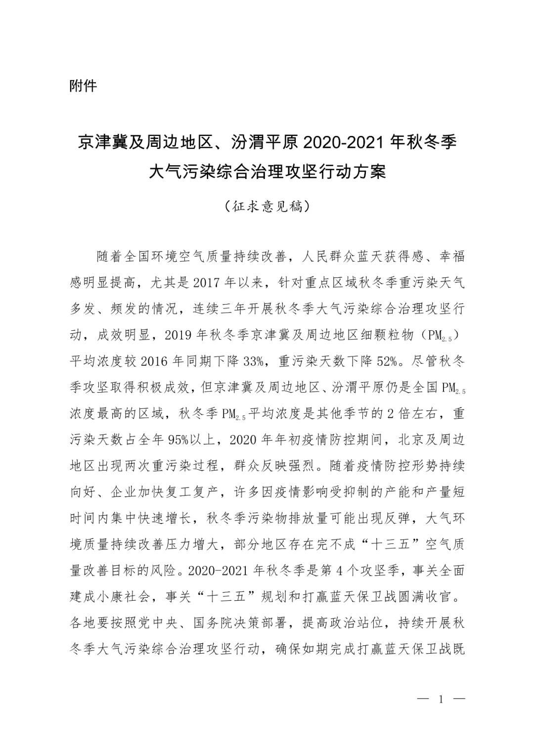 9月28日,生態(tài)環(huán)境部印發(fā)了關(guān)于征求《京津冀及周邊地區(qū)、汾渭平原2020-2021年秋冬季大氣污染綜合治理攻堅行動方案(征求意見稿)》。