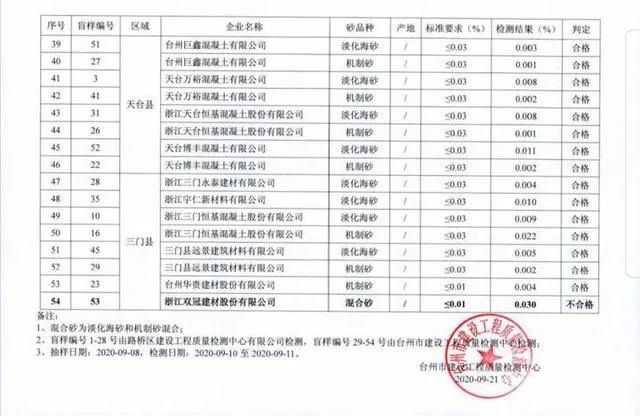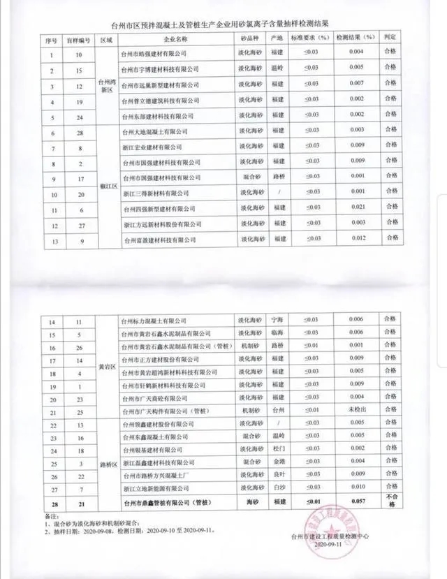 從臺州市住建局獲悉, 9月8號至9月11號,該局對全市預拌混凝土及管樁生產企業用砂氯離子含量進行了抽樣檢測,發現臺州市某管樁有限公司的海砂、浙江某建材股份有限公司的混合砂檢測結果為“不合格”,分別為0.057%和0.03%。