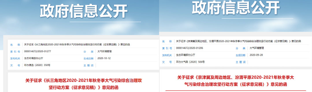 9月28日,生態環境部曾發布《京津冀及周邊地區、汾渭平原2020-2021年秋冬季大氣污染綜合治理攻堅行動方案(征求意見稿)》。