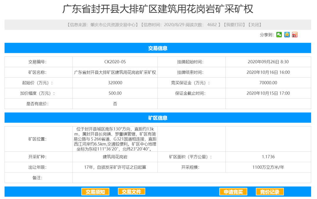 早在8月29日,肇慶市公共資源交易中心正式掛牌出讓廣東省封開縣大排礦區建筑用花崗巖礦采礦權。