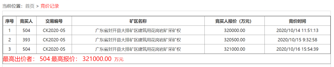 此次礦權由肇慶潤信新材料有限公司以32.1億元競得,拍得資源單價20.45元/立方米。從肇慶市公共資源交易中心得知,此次競拍,一共有兩家企業參與。