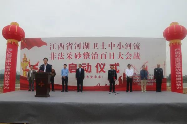 9月29日上午,專項行動在吉安市永豐縣啟動。吉安市副市長朱曉東致辭。江西省水利廳副廳長蔡勇講話,要求提高政治站位,充分認清專項整治現實意義;借力掃黑除惡,緊抓管控難點嚴打非法采砂;強化溝通協作,全面落實常治長效工作機制;加強宣傳發動,努力擴大社會參與輿論攻勢。永豐縣政府領導就如何組織好、開展好中小河流非法采砂整治行動進行發言。江西省水政總隊主要負責人宣布河湖衛士中小河流非法采砂整治百日大會戰啟動。