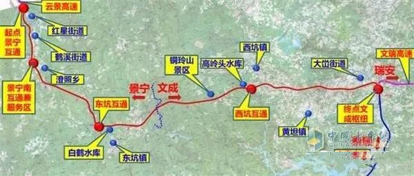 建設規模:本項目全長68km,高速公路標準,雙向四車道,設計速度80km/h,路基寬度25.5m。主線橋梁15km/37座,隧道38.3km/21座,一般互通 4 處,樞紐互通 1 處(與文泰段及文瑞段的文成樞紐合建),服務區 2 處,收費站 4 處,養護工區 2 處,管理分中心 1 處(與文泰段合建),隧道管理站 2 處,隧道救援站 1 處。