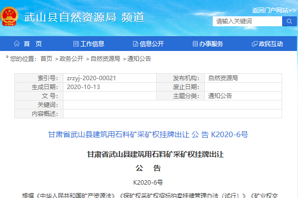 近日,武山縣自然資源局發布《甘肅省武山縣建筑用石料礦采礦權掛讓公告》礦山有關事項如下: