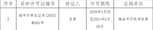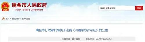 近日,小編從瑞金市人民政府網了解到,公示公告發布了《瑞金市行政審批局關于注銷《河道采砂許可證》的公告》,詳情如下: