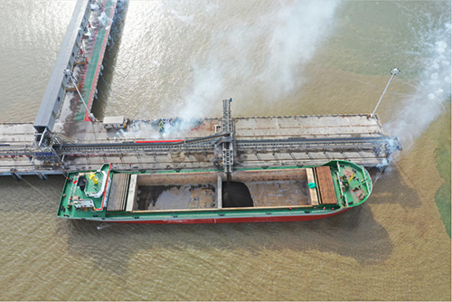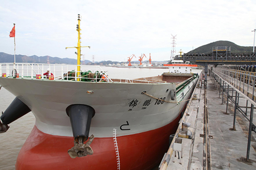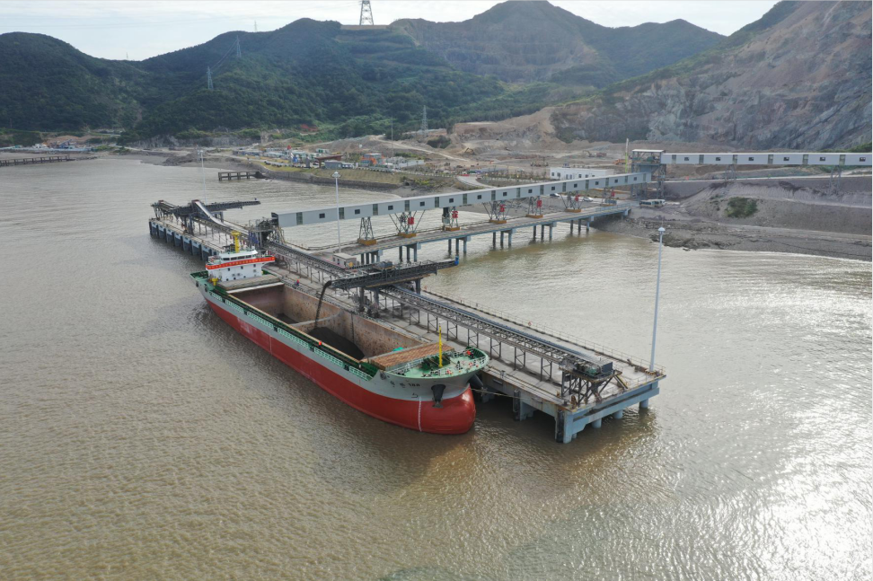 10月25日下午2點28分,在舟山定海冊子島的省交通集團大皇山礦一號碼頭,傳送帶源源不斷地將