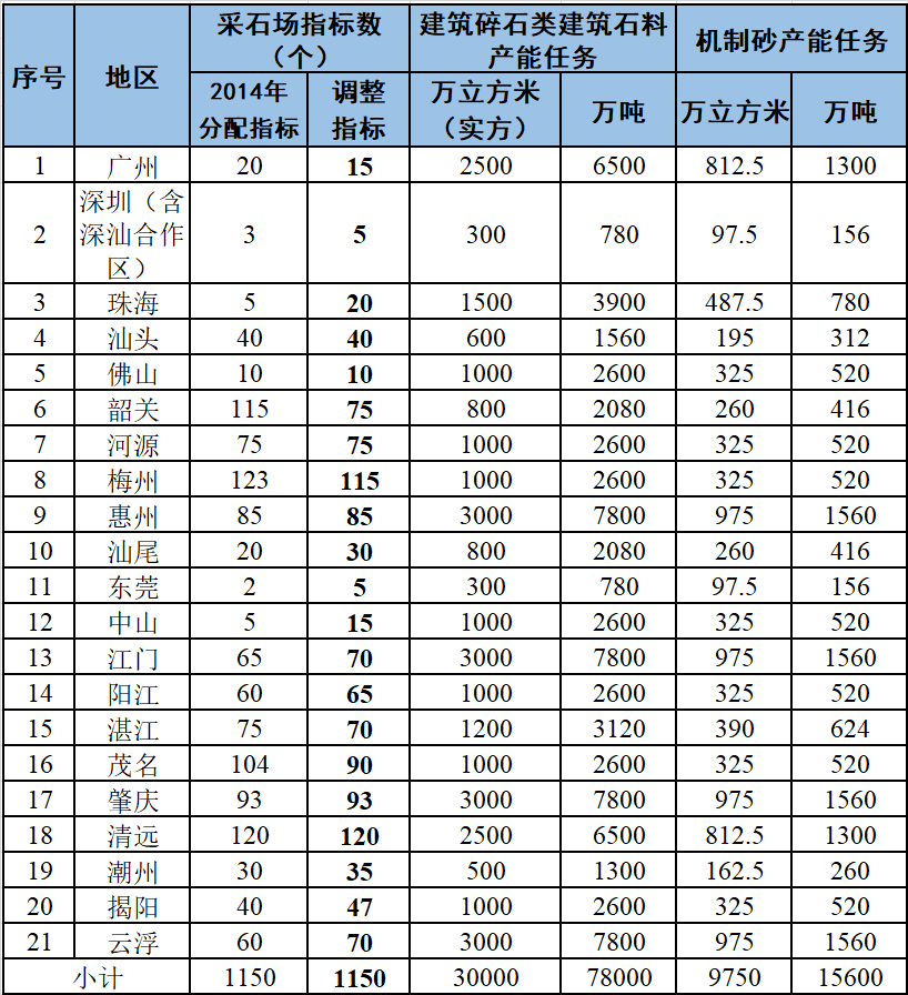 一、廣東省將維持全省采石場數量1150個的總量控制指標不變,優化各地采石場指標配置(詳見下圖);明確全省年產建筑碎石類建筑石料30000萬立方米(實方)產能任務;在廣州、珠海、韶關、河源、惠州、江門、陽江、肇慶、清遠、云浮等市要重點建設若干儲量規模1億立方米以上的特大型建筑石料生產基地;同步規劃機制砂產能等五點要求。