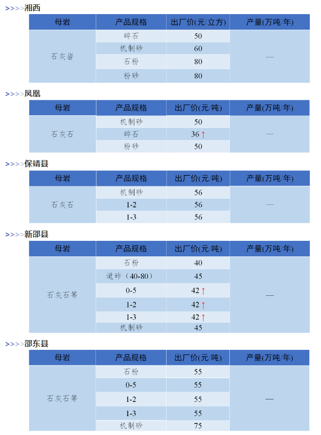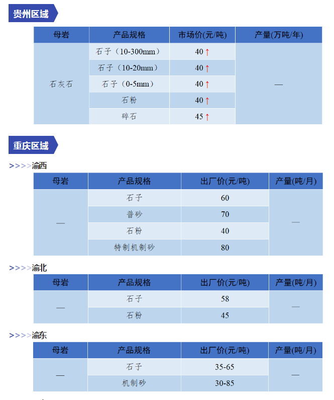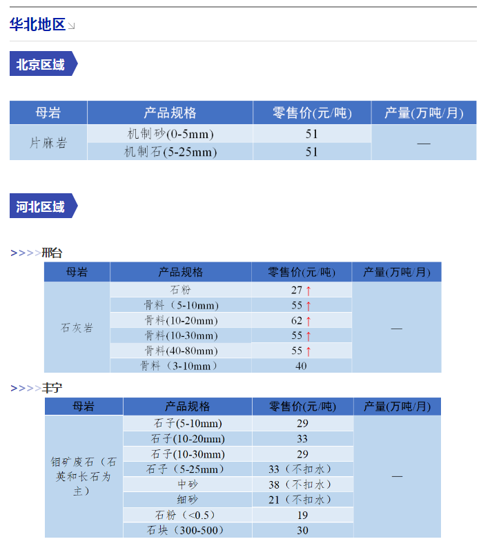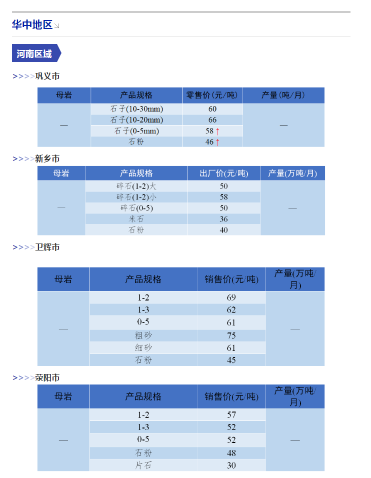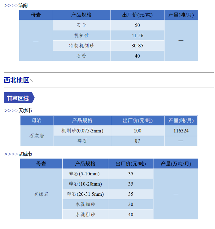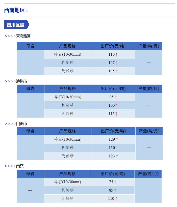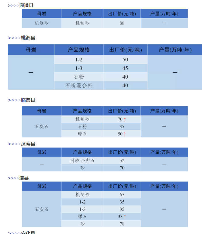 ◇ 全國多數地區砂石價格普遍緩慢上漲。其中四川區域價格上漲天然砂出廠價為105元/噸,機制砂為107 元/噸,碎石(10-30mm)110元/噸。湖南省長沙市黃砂粗砂出廠價為126/噸,機制砂為86元/噸,卵石為76/噸。