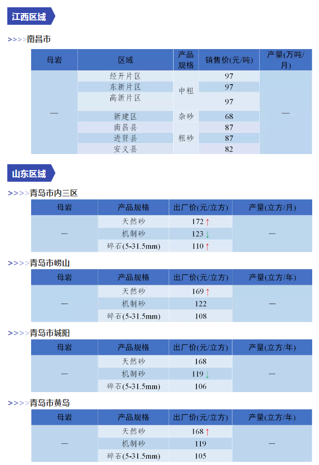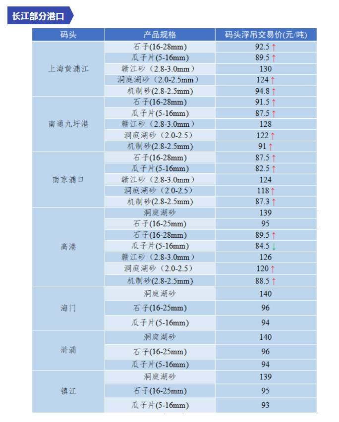 ◇ 長江部分港口受運輸成本的提升,價格保持漲勢運行,上海黃浦江贛江砂(2.8-3.0mm)碼頭浮吊交易價130元/噸,洞庭湖砂(2.0-2.5mm)124元/噸,機制砂(2.8-2.5mm)94.8元/噸。高港洞庭湖砂碼頭浮吊交易價139元/噸,洞庭湖砂(2.0-2.5mm)120元/噸,機制砂88.5元/噸。