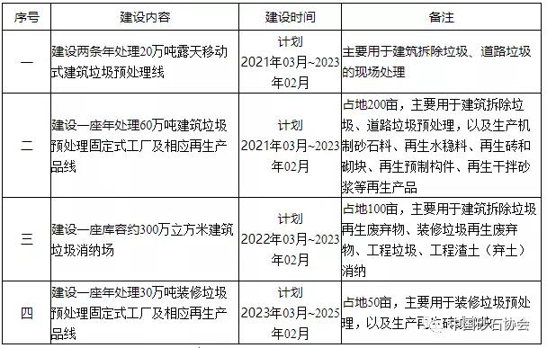 注:①表中關(guān)于再生產(chǎn)品生產(chǎn)線,特許經(jīng)營者可根據(jù)再生產(chǎn)品市場需求,在特許經(jīng)營期限內(nèi)進(jìn)行靈活調(diào)整,可調(diào)整新設(shè)1條再生混凝土生產(chǎn)線、1條再生高端環(huán)保輕質(zhì)燒結(jié)磚砌塊生產(chǎn)線、1條瀝青冷熱再生生產(chǎn)線等。