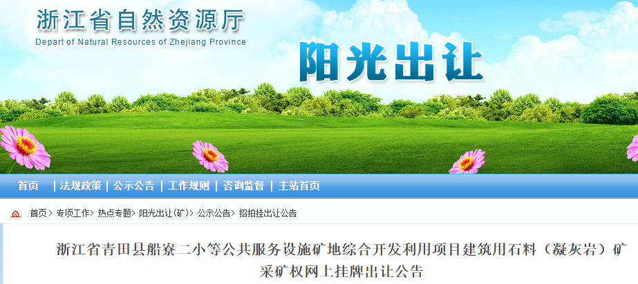 2020年10月16日,浙江省公共資源交易中心正式開拍青田縣船寮二小等公共服務設施礦地綜合開發利用項目建筑用石料(凝灰巖)礦采礦權,此礦權基本信息如下:
