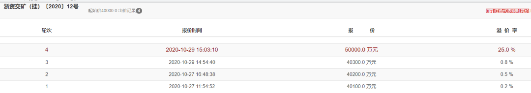 此礦權起拍價40,000萬元,最終經過4輪競價被新昌縣大源礦業有限公司以5億元拍下,平均拍得資源單價29.4元/噸。