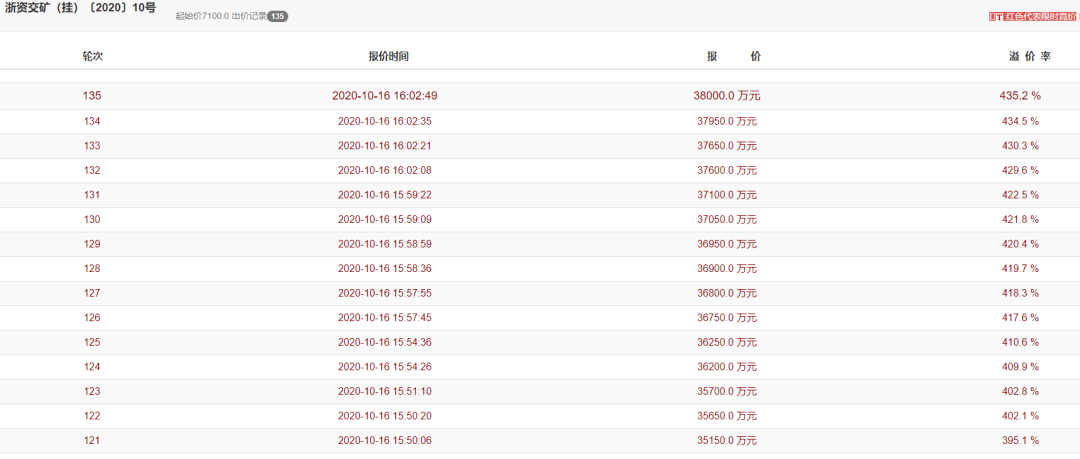 此礦權起拍價7100萬元,最終經過135次出價,被青田縣交通發展投資有限公司以3.8億拍下,溢價率高達435.2%,平均拍得資源單價15.2元/噸。