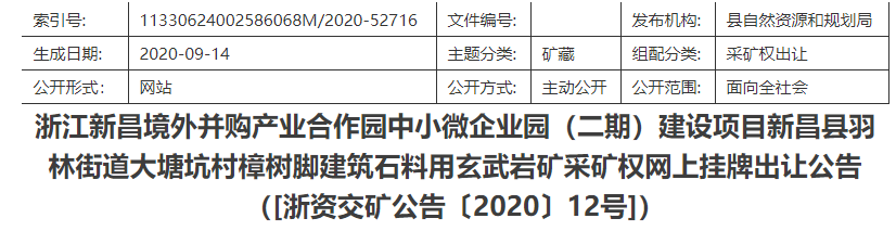 2020年10月29日,浙江省自然資源公共交易中心正式開拍新昌境外并購產業合作園中小微企業園(二期)建設項目新昌縣羽林街道大塘坑村樟樹腳建筑石料用玄武巖礦采礦權,此礦權基本信息如下: