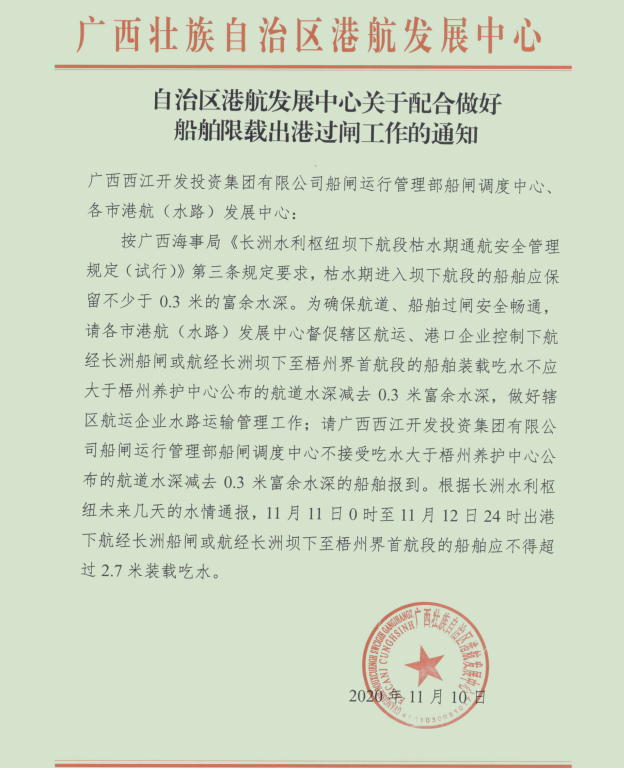 隨后廣西壯族自治區港航發展中心又發布通知,請廣西西江開發投資集團有限公司船閘運行管理部船閘調度中心不接受吃水大于梧州養護中心公布的航道水深減去0.3米富余水深的船舶報道。