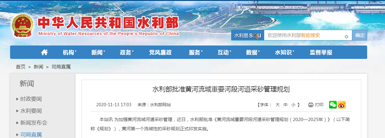 為加強黃河流域河道采砂管理,近日,水利部批準《黃河流域重要河段河道采砂管理規劃(2020—2025年)》(以下簡稱《規劃》),黃河第一個流域性的采砂規劃正式印發實施。