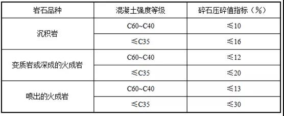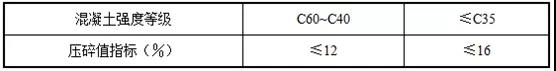 當混凝土強度等級大于或等于C60時,應進行巖石抗壓強度檢驗。碎石和卵石的壓碎值指標如下: