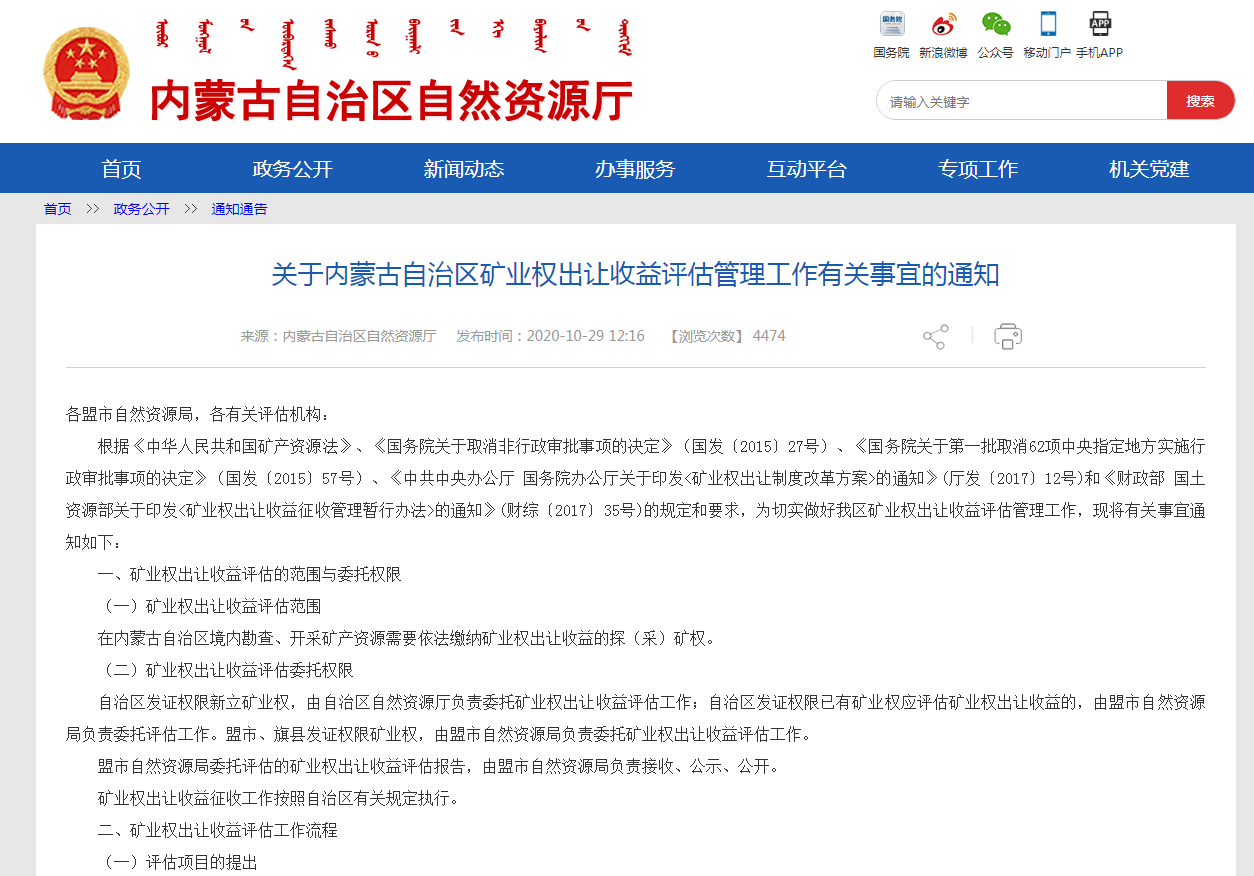 為切實做好全區礦業權出讓收益評估管理工作,日前,內蒙古自治區自然資源廳印發《關于內蒙古自治區礦業權出讓收益評估管理工作有關事宜的通知》。