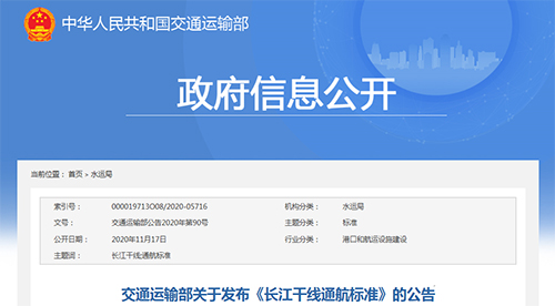 交通運輸部文件指出,為統一長江干線通航技術要求,促進長江干線通航標準化,交通運輸部于 2015 年發布實施了《長江干線通航標準》(JS180-4-2015)。該標準實施以來,在長江黃金水道建設發展及長江干線航運資源保護等方面發揮了重要作用,經濟和社會效益明顯。