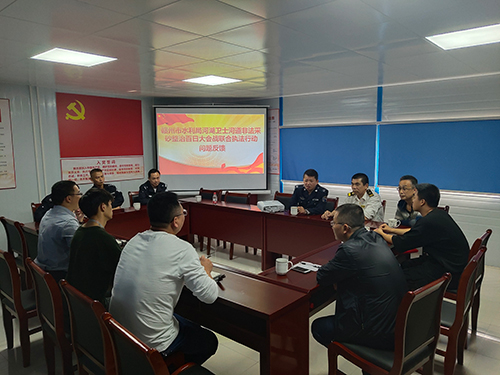 隨后,聯合執法人員來到贛江水西鎮和樂圍清淤疏浚臨時堆料點進行檢查,并在該處組織召開了“贛州市水利局河湖衛士河道非法采砂整治百日大會戰聯合執法行動問題反饋會”,會上,贛州市水政監察支隊長郭銳同志,對清淤疏浚單位宣講了相關水法律法規和掃黑除惡專項斗爭相關政策,并要求清淤疏浚單位必須嚴格按照水法律法規和此次《河道防洪清淤疏浚整治工程(貢江茅店~八境臺段)清淤疏浚