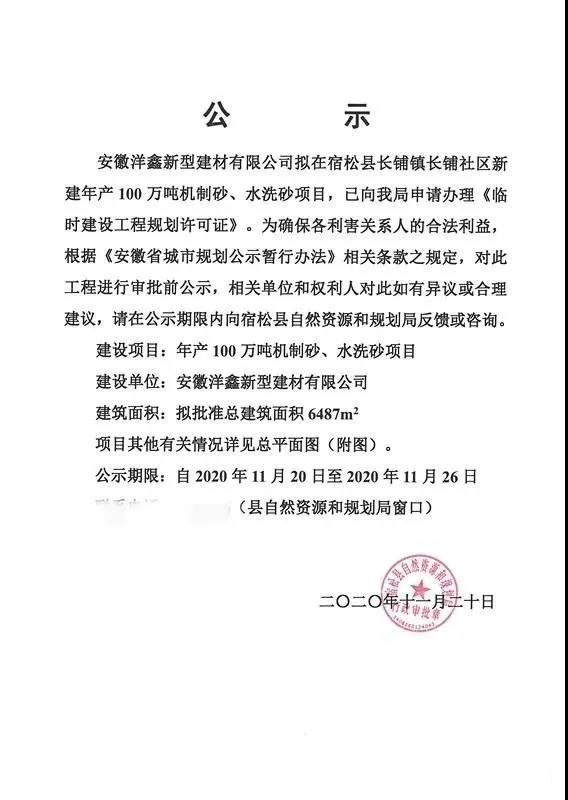 據悉,安徽洋鑫新型建材有限公司擬在安徽省安慶市宿松縣長鋪鎮長鋪社區新建年產100萬噸機制砂、水洗砂項目,已向縣自然資源和規劃局申請辦理《臨時建設工程規劃許可證》。