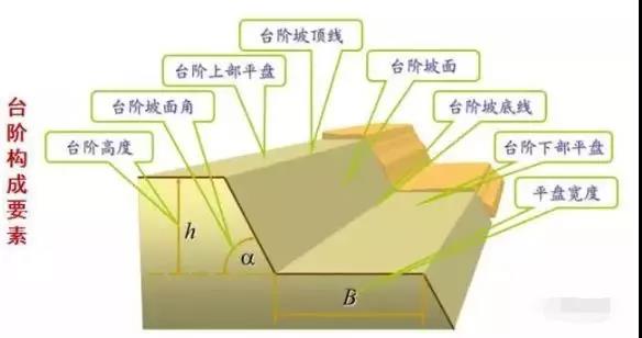 露天礦邊坡由臺階、臺階上部平盤、臺階下部平盤、臺階坡面、臺階坡面角、臺階高度、臺階坡頂線、臺階坡底線等構成。