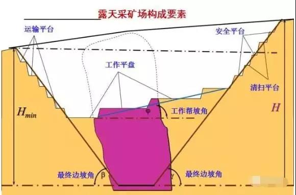 臺階根據其用途可分為工作平臺、安全平臺、清掃平臺、運輸平臺等。最終邊坡是指開采到最終界面的臺階所組成的邊坡。最終邊坡角是指最終邊坡坡面與水平面之間的夾角。