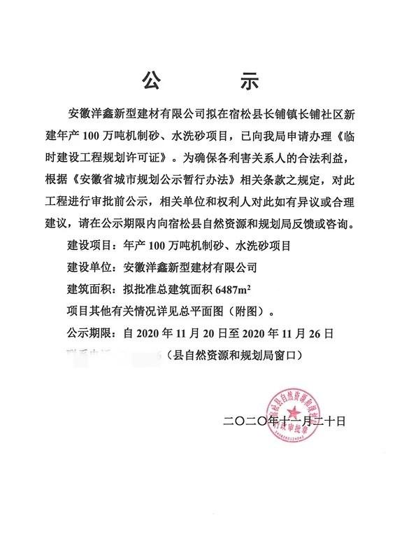 安徽洋鑫新型建材有限公司擬在宿松縣長鋪鎮長鋪社區新建年產100萬噸機制砂、水洗砂項目,已向我局申請辦理《臨時建設工程規劃許可證》。