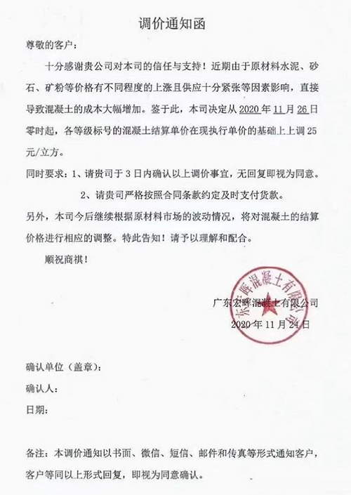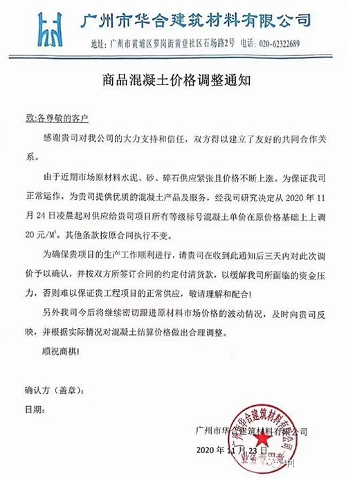 由于近期市場原材料砂、石料,水泥價格不同程度上漲的影響,尤其是河砂價格急劇上升,資源短缺,導致混凝土的成本增加。為保證我司正常運作,為貴司提供優質的混凝土產品及服務。經研究決定于2020年11月25日零時起,我司出廠的混凝土在現執行價格基礎上上調20元/m?)。其他條款不變按原合同執行。