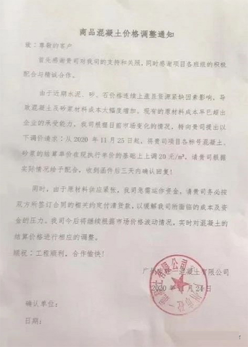 由于近期市場原材料水泥、砂、碎石供應緊張且價格不斷上漲。為保證我司正常運作,為貴司提供優質的混凝土產品及服務,經我司研究決定從2020年11月24日凌晨起對供應給貴司項目所有等級標號混凝土單價在原價格基礎上上調20元/方。其他條款按原合同執行不變。